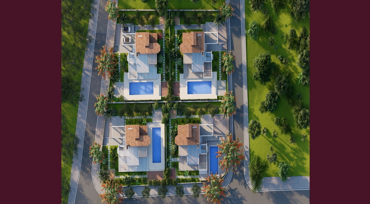 It is located in the town of Karşıyaka in Northern Cyprus with a magnificent view. The landscaped, state-of-the-art residential complex is surrounded by luxury villas, a walking path overlooking the Karşıyaka football field, and breathtaking views of the Mediterranean. In addition, the back of the villas offers the legendary view of the magnificent Kornos Mountain, behind which the protected Kornos Forest is located. The design concept is based on an authentic Cypriot building style with modern elements.